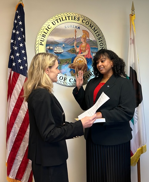 Leuwam Tesfai taking the oath of office from former CPUC President Alice Reynolds